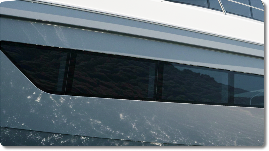 O vidro de costado é o conjunto de painéis fixos instalados ao longo das laterais da embarcação, integrando ambiente interno com o mar.
