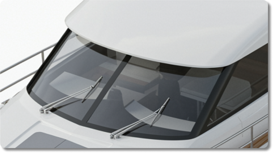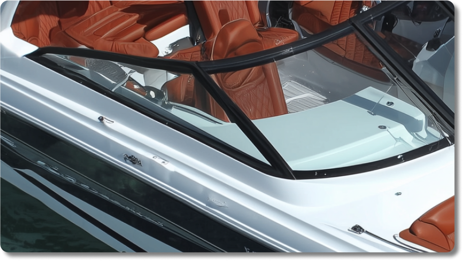 Para embarcações maiores, utilizamos vidro laminado, reto ou curvo, colado à estrutura para mais rigidez e segurança, alinhado ao design da embarcação.